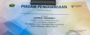 _Alhamdulillah_ , atas ridho Allah Ta’ala kemudian dukungan Bapak/Ibu wali santri semua, santri MA al-Umm meraih *Juara Favorit* dalam *Lomba Vlog (Video Blog)* _”Generasi Bebas Anemia”_ dalam rangka Peringatan Hari Remaja International Kota Malang Tahun 2019.